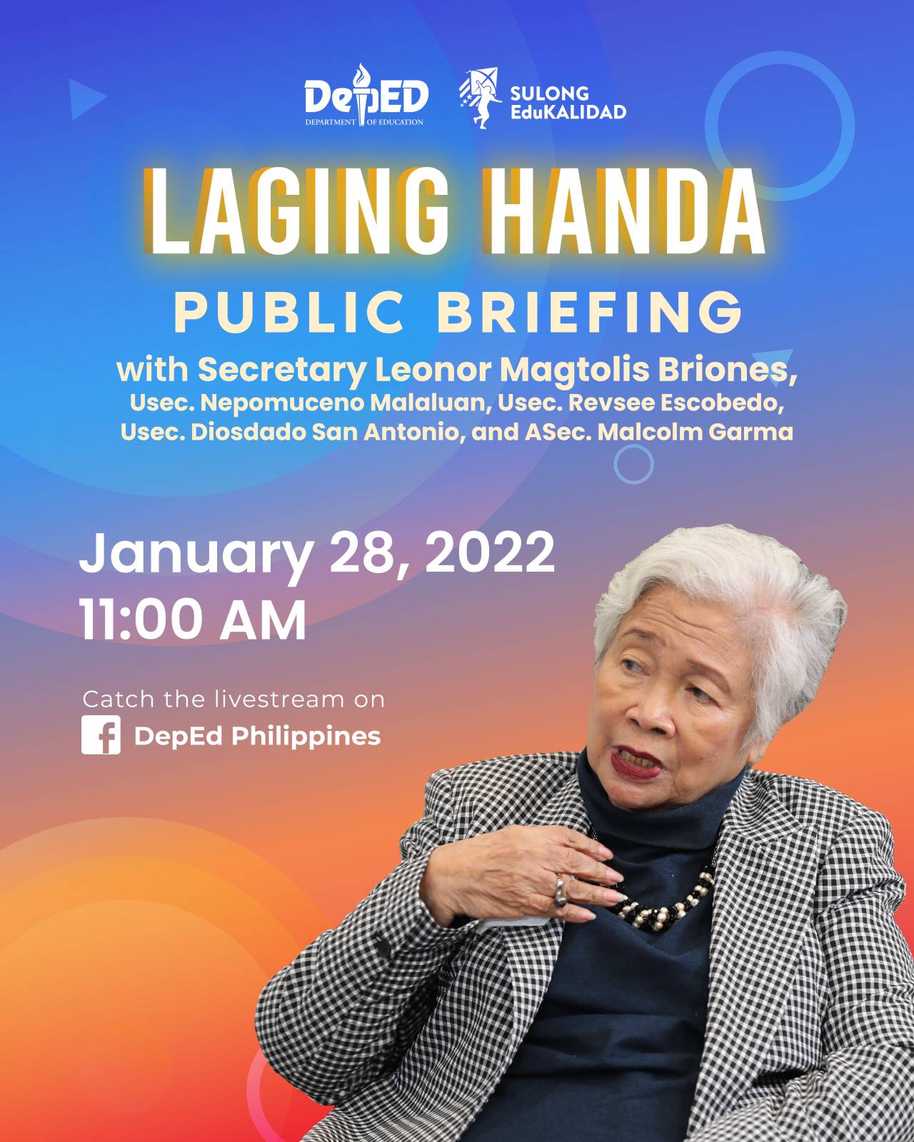 Briones said that the pilot run for private schools will. 2007 and 37 s. DepEd Secretary Leonor Briones went live on the Laging Handa Public Briefing to announce the opening of classes amidst the new normal.